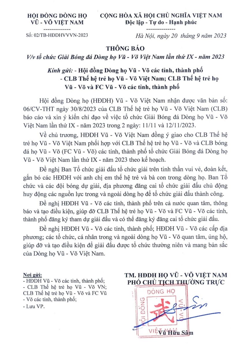 CLB Thế hệ trẻ họ Vũ - Võ Việt Nam do Ông Vũ Xuân Kiên - Chủ nhiệm ngay từ khi thành lập đến nay đã tròn 14 năm (2009-2023) và đã tổ chức được 08 giải đấu bóng đá Dòng họ Vũ - Võ Việt Nam, thông qua các mùa giải đã phát huy được sự gắn kết đồng tộc, Anh chị em biết đến nhau nhiều hơn và làm lan tỏa những giá trị truyền thống của dòng họ Vũ - Võ Việt Nam đối với thế hệ trẻ dòng họ Vũ - Võ Việt Nam. Ngày 30/8/2023 CLB thế hệ trẻ họ Vũ - Võ Việt Nam đã gửi văn bản tới Hội đồng dòng họ Vũ - Võ Việt Nam và đã nhận được nhất trí chủ trương và kế hoạch tổ chức Giải bóng đá dòng họ Vũ - Võ Việt Nam lần thứ IX năm 2023 và giao cho CLB Thế hệ trẻ họ Vũ - Võ Việt Nam phối hợp với các CLB thế hệ trẻ dòng họ Vũ - Võ và các CLB bóng đá dòng họ Vũ - Võ trên toàn quốc để tổ chức giải đấu theo kế hoạch ( theo văn bản đính kèm)