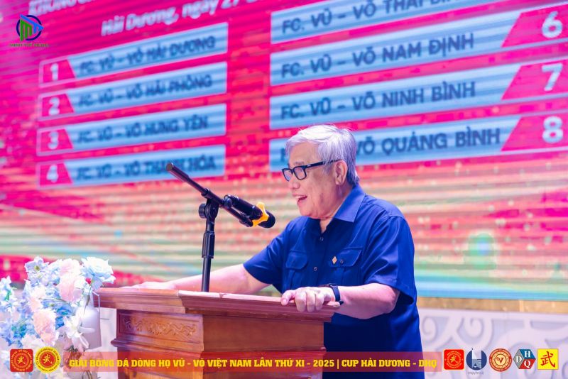 Phát biểu tại Gala Tổng kết, GS.TSKH.NGND Vũ Minh Giang, Chủ tịch HĐDH Vũ - Võ Việt Nam chúc mừng sự thành công của Giải Bóng đá Dòng họ Vũ - Võ Việt Nam lần thứ XI - năm 2025. Đồng thời, nhiệt liệt biểu dương Ban Chỉ đạo và Ban Tổ chức cùng 8 đội bóng tham dự đã tạo nên thành công rực rỡ của Giải bóng đá năm nay.