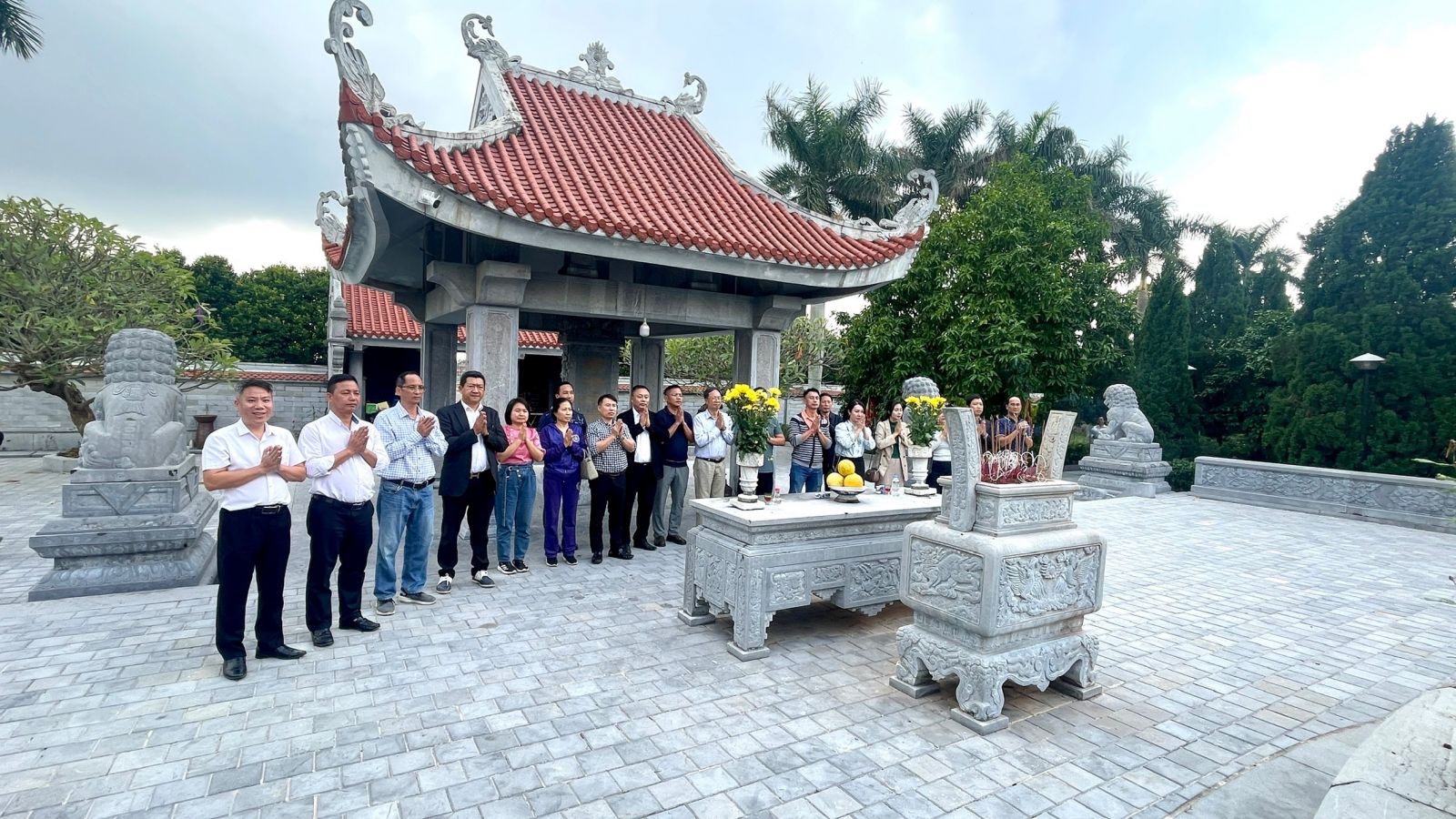Ảnh: Đoàn Hội Doanh nhân Vũ – Võ Hải Phòng chụp ảnh lưu niệm trước Miếu thờ cụ cao cao tổ Vũ Tiên Oanh.