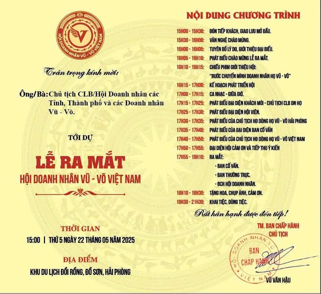 Chủ tịch Hội Doanh nhân Vũ - Võ Hải Phòng trân trọng kính mời Quý Anh/Chị Doanh nhân đăng ký tham dự sự kiện, thông qua Ban Chủ tịch Hội trước 17h ngày 20/5/2025.