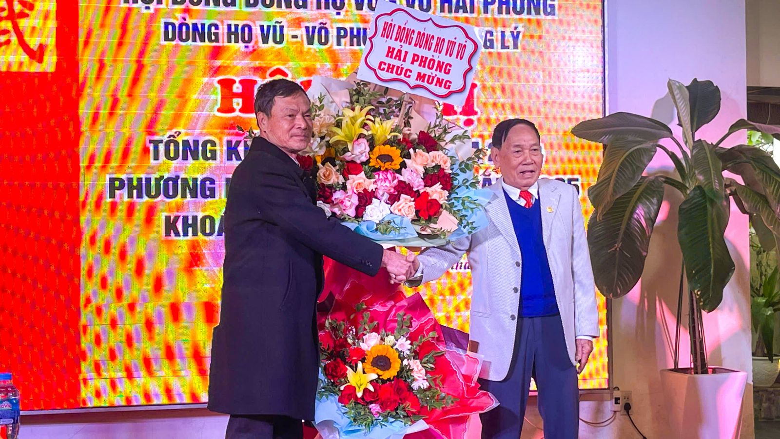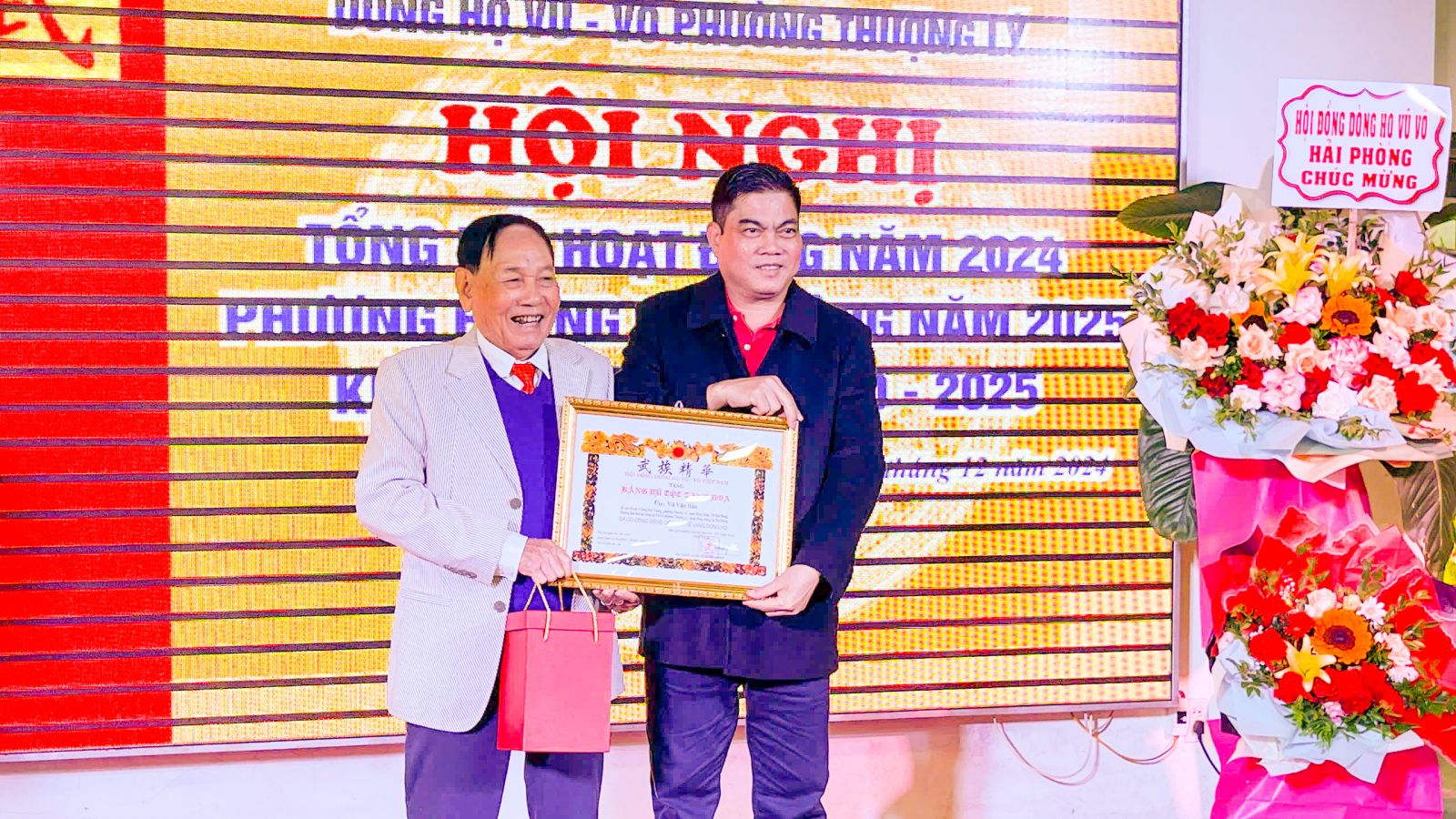 Ông Vũ Nguyên Thái TM HĐ dòng họ Vũ - Võ Việt Nam trao tặng bằng Vũ Tộc Tinh Hoa cho cụ Vũ Văn Bảo - Chủ tịch HĐ dòng họ Vũ - Võ phường Thượng Lý