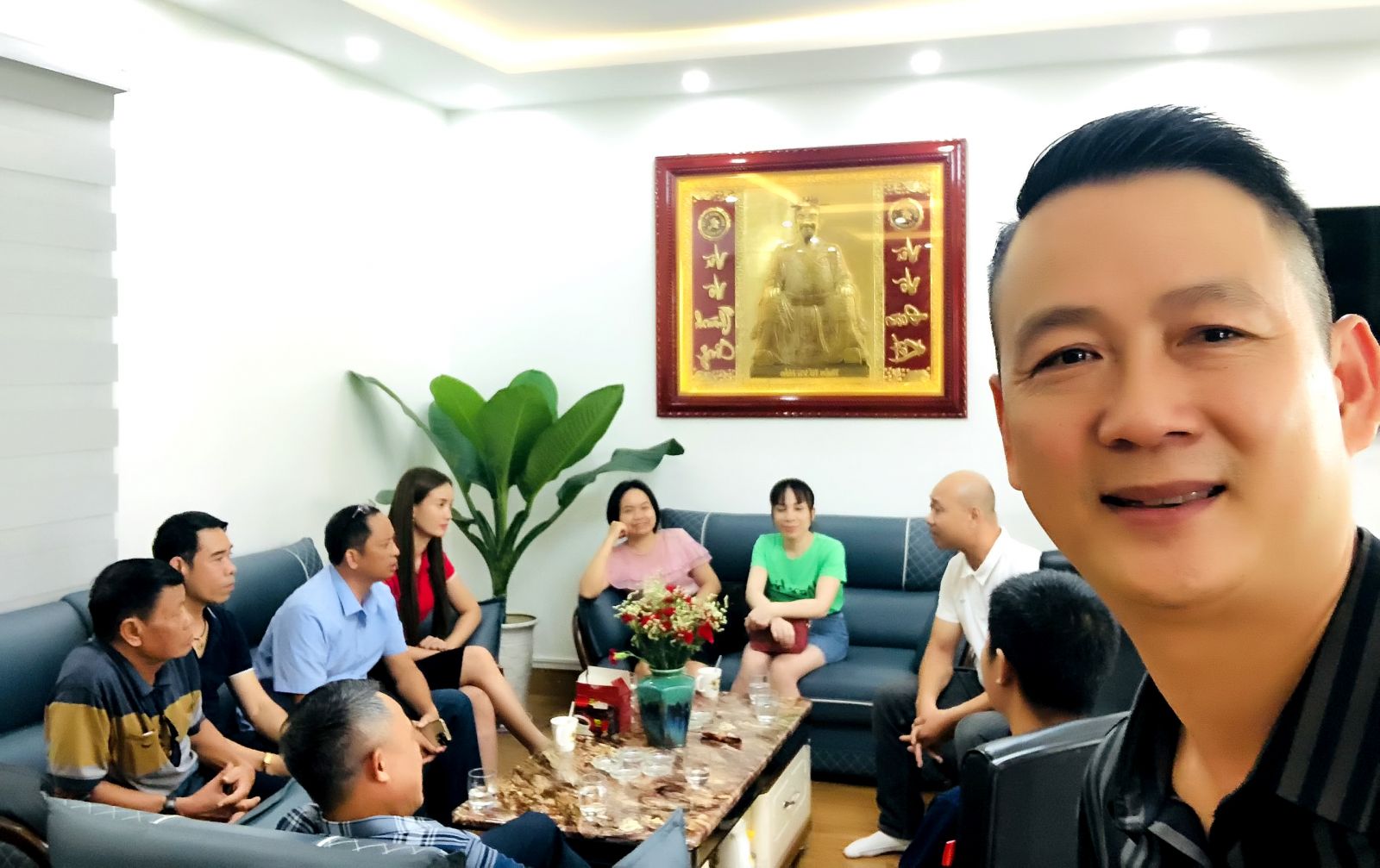 Rời phòng hội trường, anh mời tôi vào phòng khách cũng là phòng làm việc của riêng anh. Một căn phòng khá rộng mà khi bước chân vào cái đập vào mắt trước tiên là bức chân dung Thần Tổ Vũ Hồn, được chạm khắc bằng đồng với hai dòng chữ hai bên: "Vũ/Võ đoàn kết - Vũ/Võ thành công” được treo ở vị trí trang trọng nhất. Đối diện là bức tranh khổ lớn, choán hết cả bức tường với khung cảnh thiên nhiên cỏ cây, chim thú; thêm một cây ghitare, một chiếc piano xinh xắn, làm cho cả căn phòng chừng ba chục m2 này ngập tràn cái văn hoá nghệ thuật.
