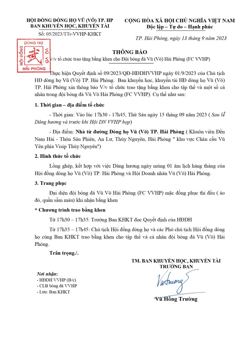Thông báo của Ban KHKT V/v tổ chức trao tặng bằng khen cho Đội bóng đá Vũ (Võ) Hải Phòng (FC VVHP)