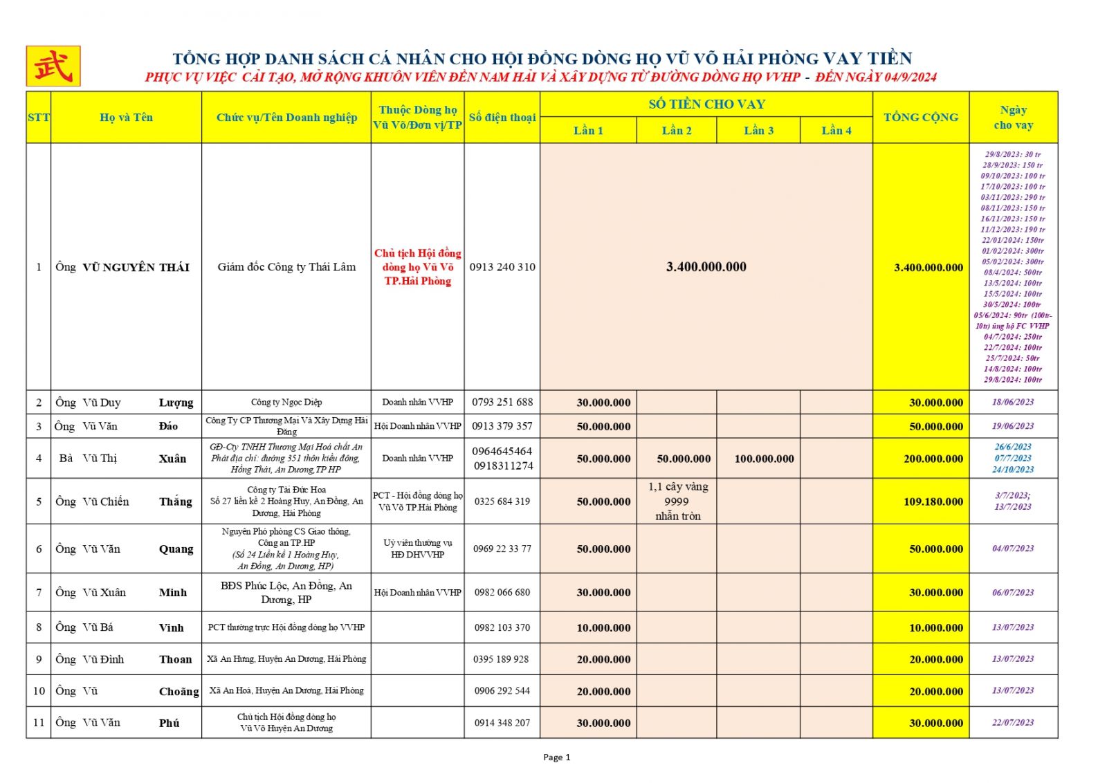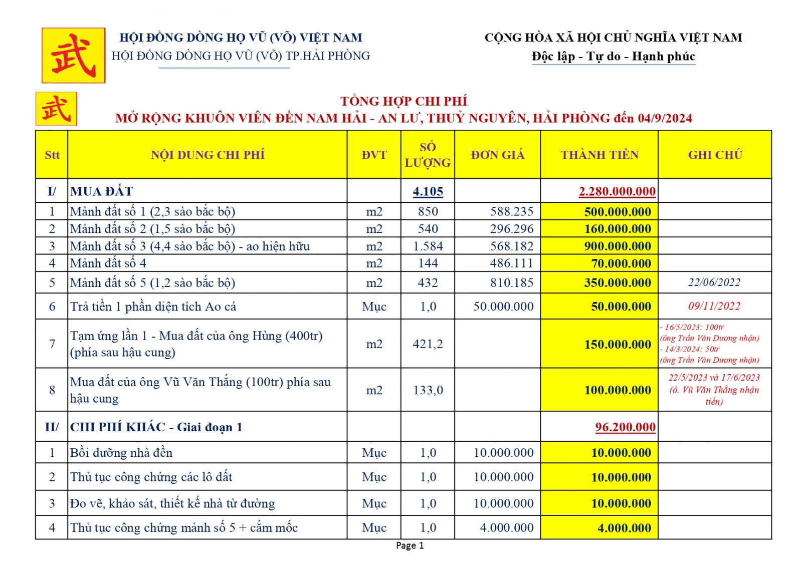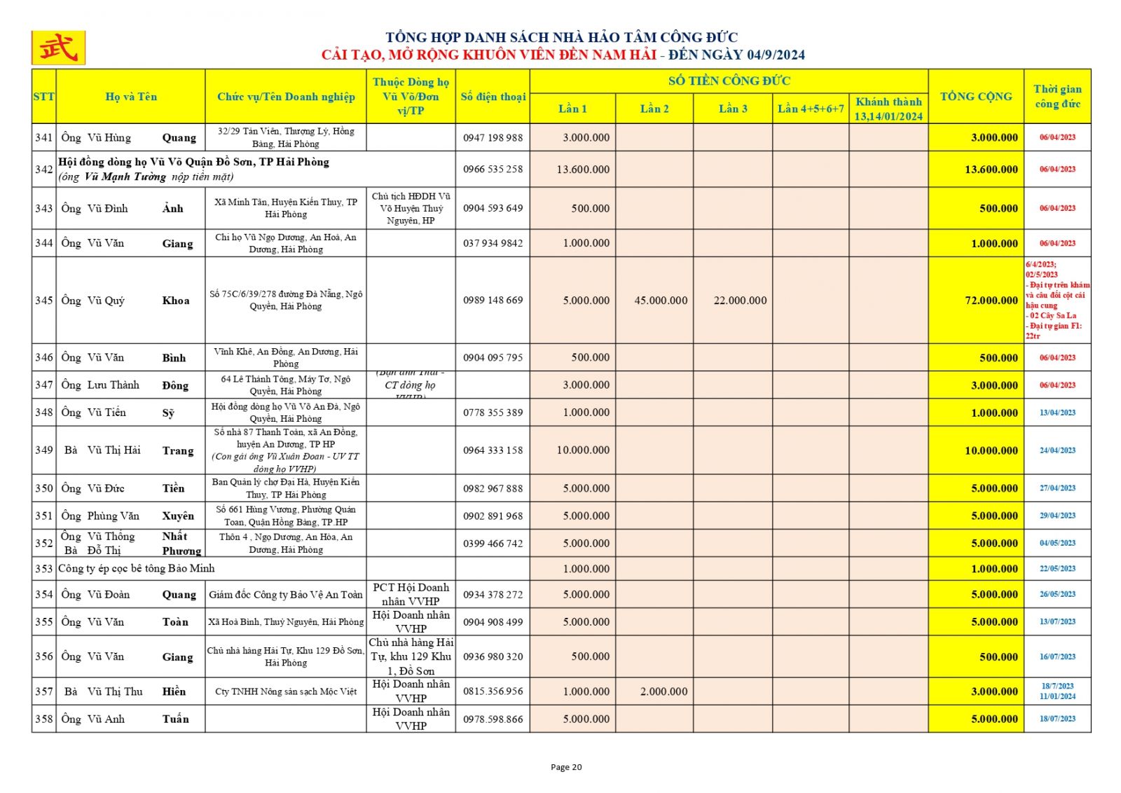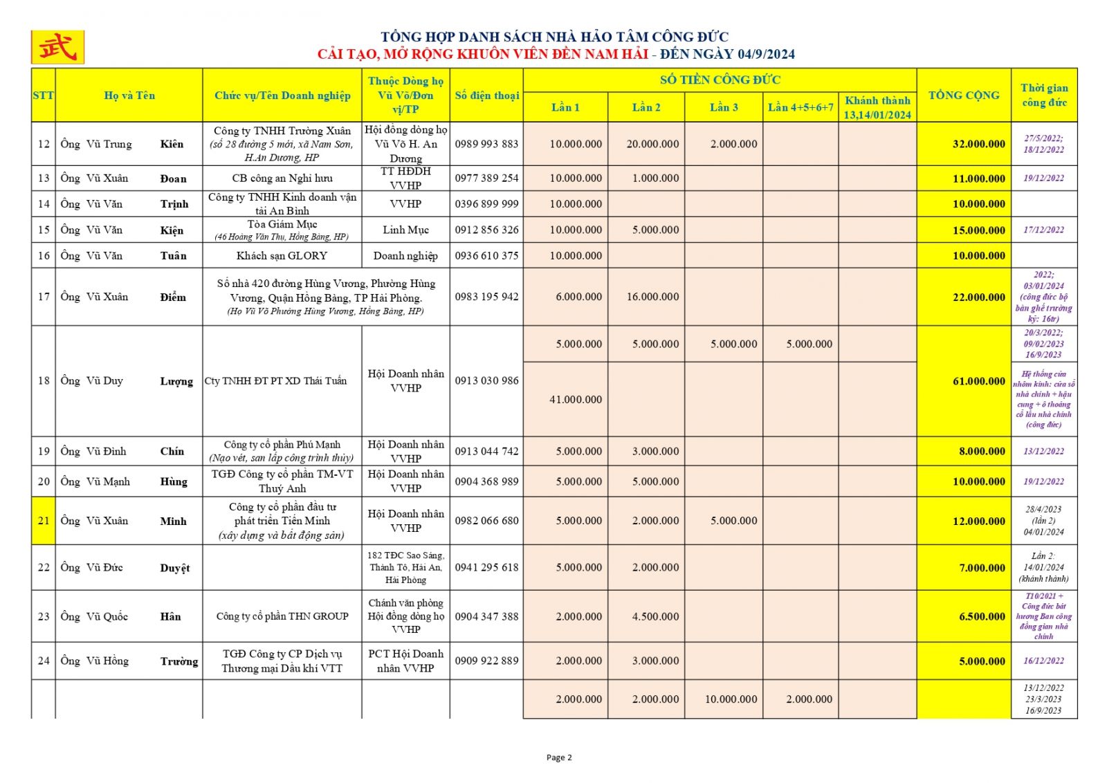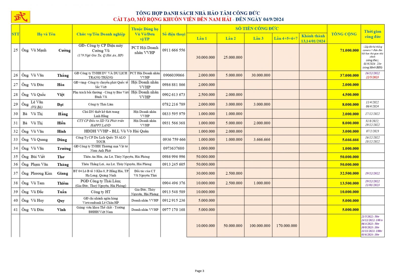 Nhằm công khai minh bạch về tài chính trong quá trình Hội đồng dòng họ Vũ (Võ) TP. Hải Phòng xây dựng và cải tạo khuôn viên Đền Nam Hải, trong đó hạng mục xây dựng mới nhà thờ Tổ Đền Nam Hải ( Từ đường dòng họ VVHP). Thường trực HĐ dòng họ VHHP báo cáo chi tiết theo thứ tự như sau: 1. Tổng hợp danh sách các nhà hảo tâm Công đức; 2. Chi phí XD...; 3. Số tiền vay; 4. Số tiền còn thiếu (Nợ) của các tổ chức và cá nhân như sau: