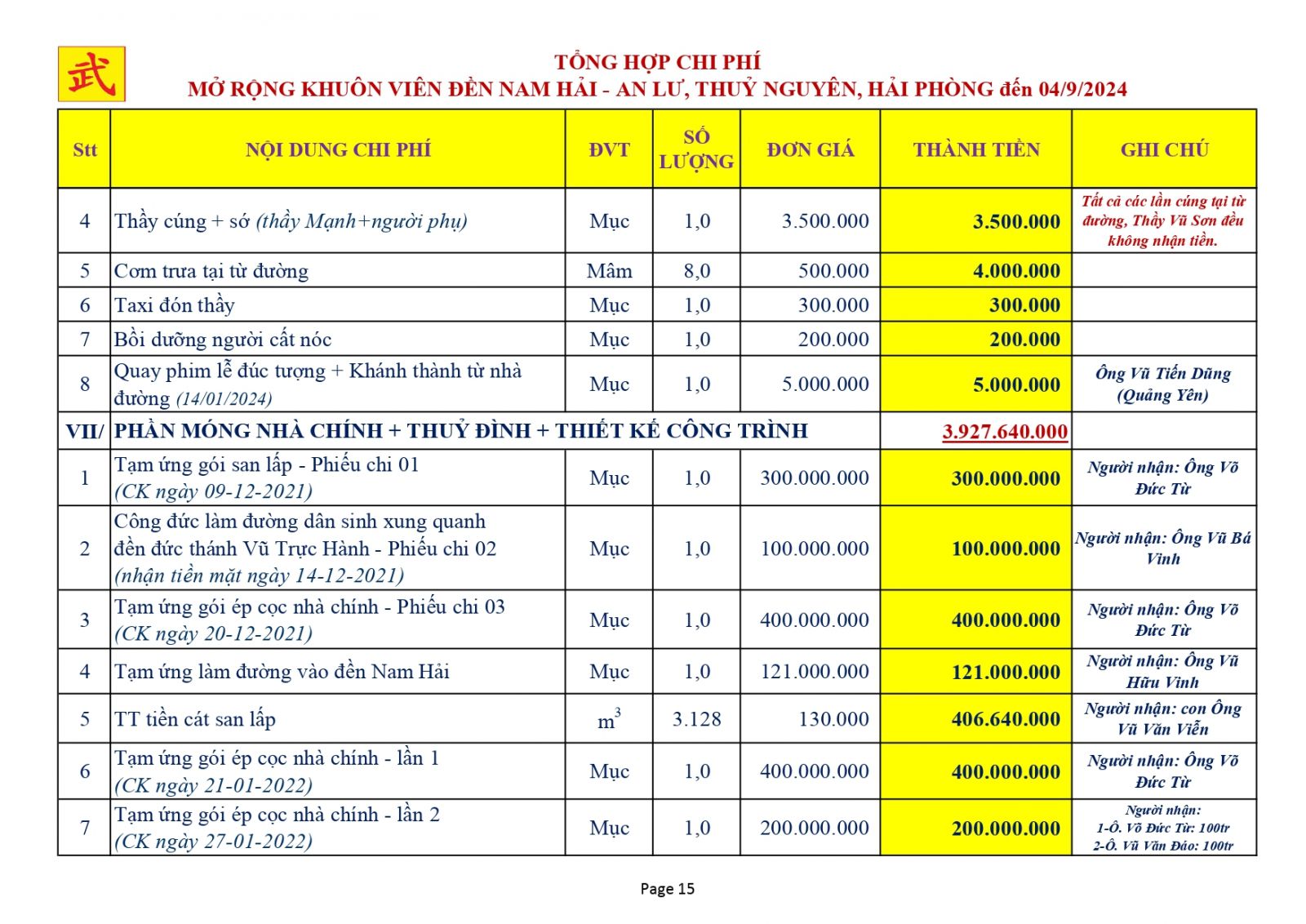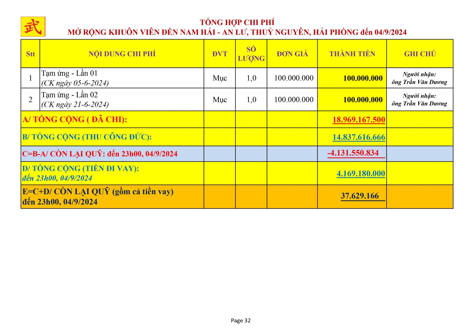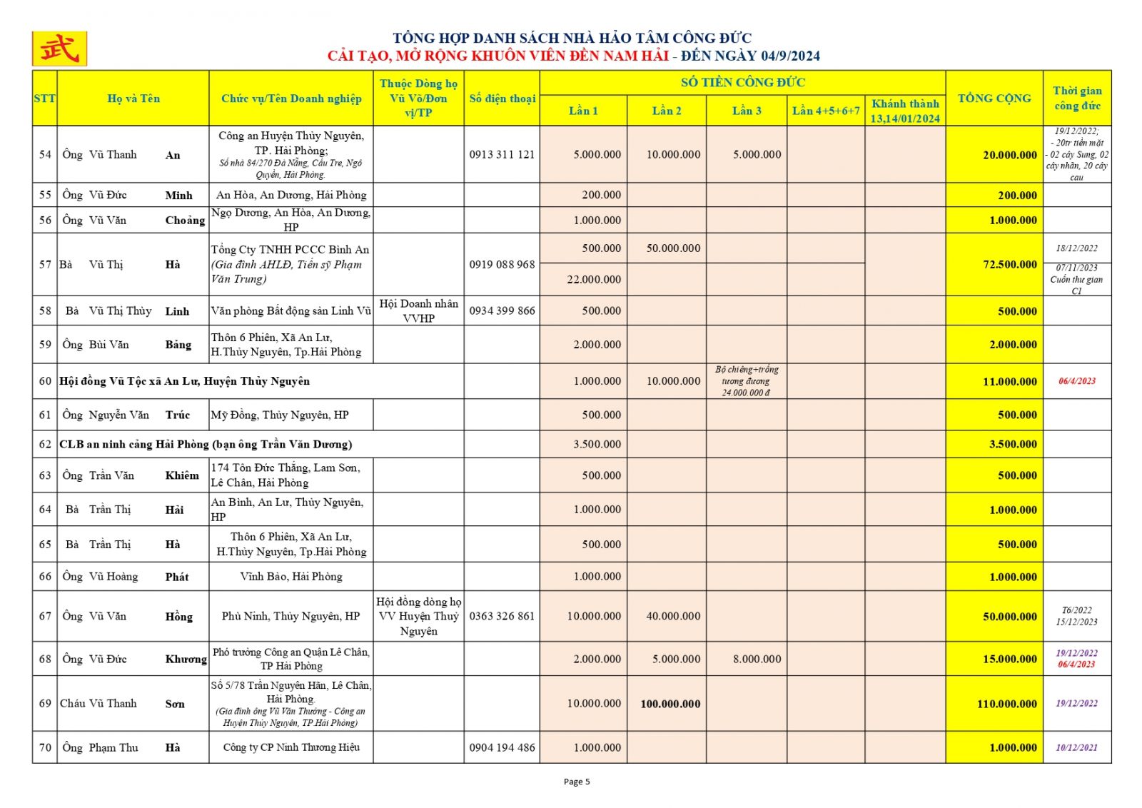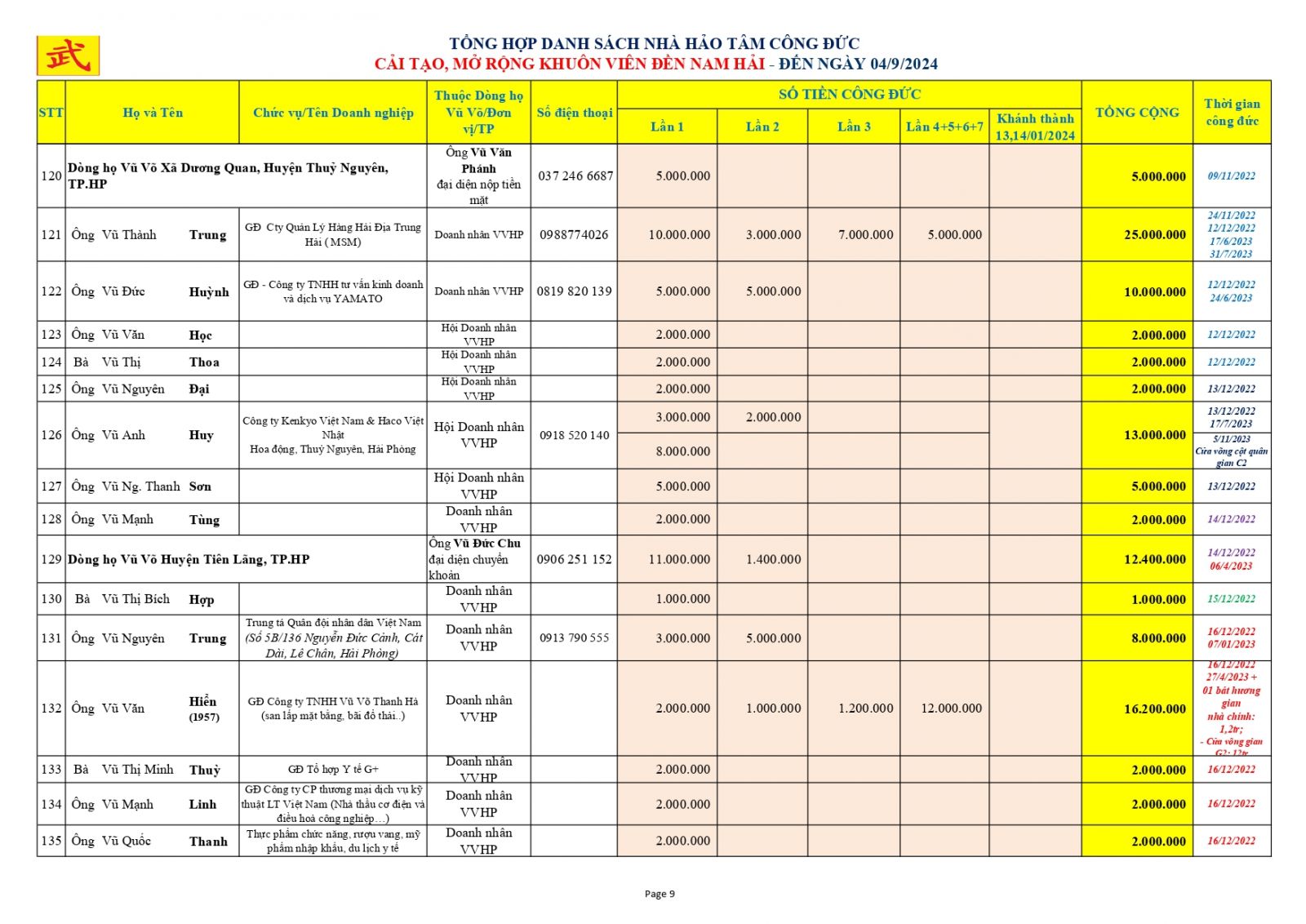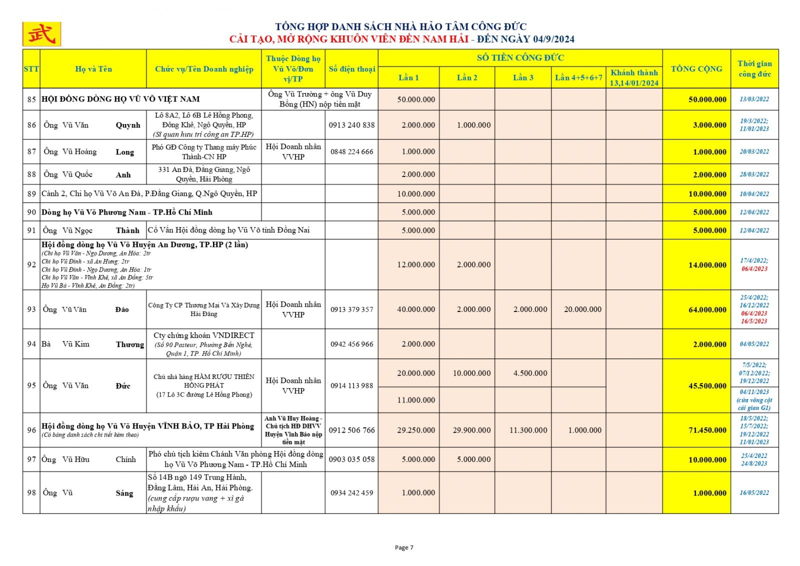 Nhằm công khai minh bạch về tài chính trong quá trình Hội đồng dòng họ Vũ (Võ) TP. Hải Phòng xây dựng và cải tạo khuôn viên Đền Nam Hải, trong đó hạng mục xây dựng mới nhà thờ Tổ Đền Nam Hải ( Từ đường dòng họ VVHP). Thường trực HĐ dòng họ VHHP báo cáo chi tiết theo thứ tự như sau: 1. Tổng hợp danh sách các nhà hảo tâm Công đức; 2. Chi phí XD...; 3. Số tiền vay; 4. Số tiền còn thiếu (Nợ) của các tổ chức và cá nhân như sau: