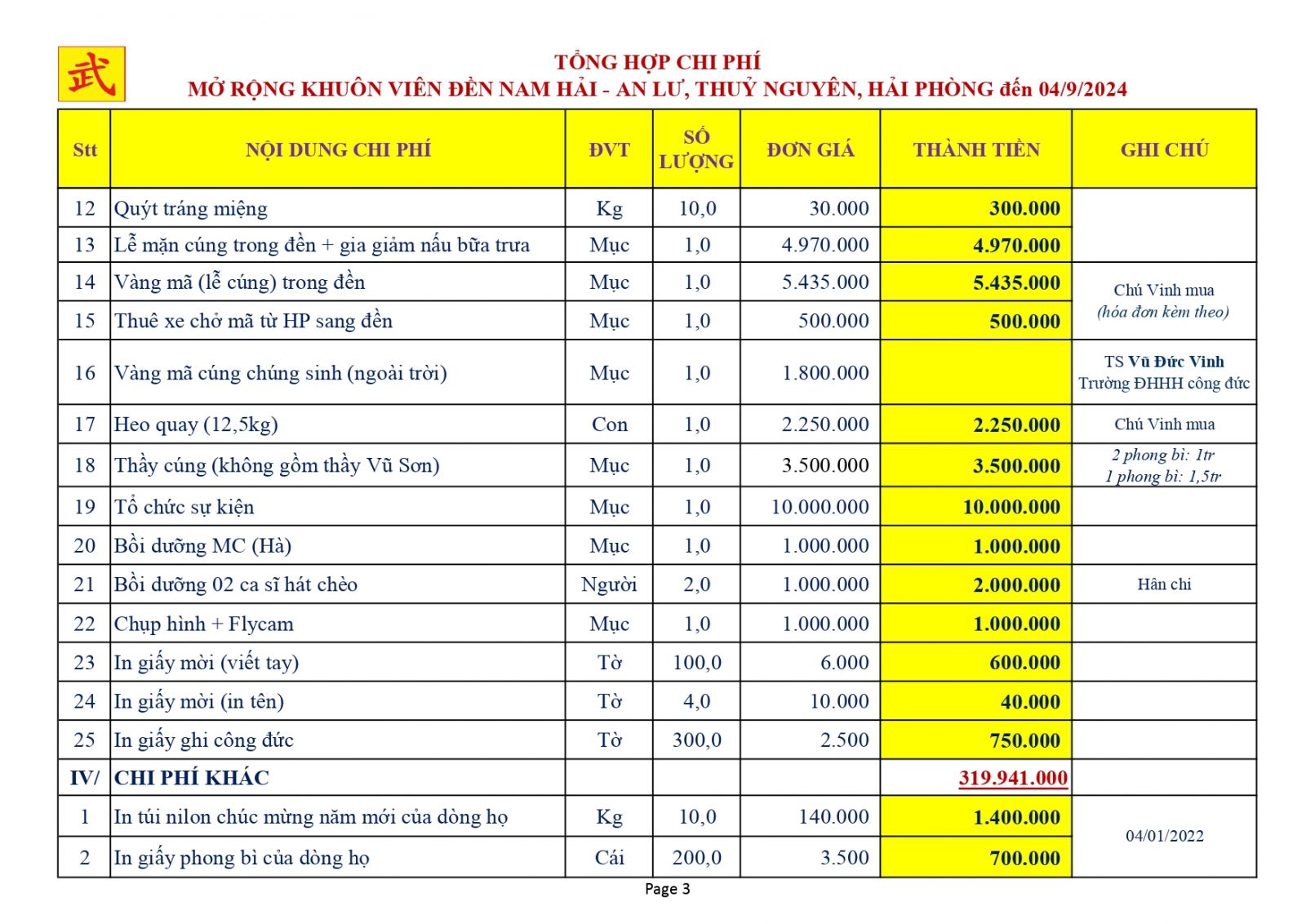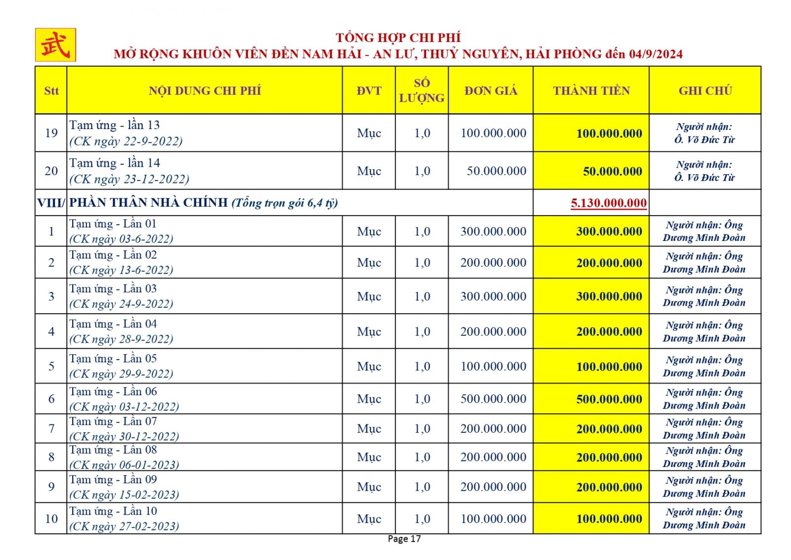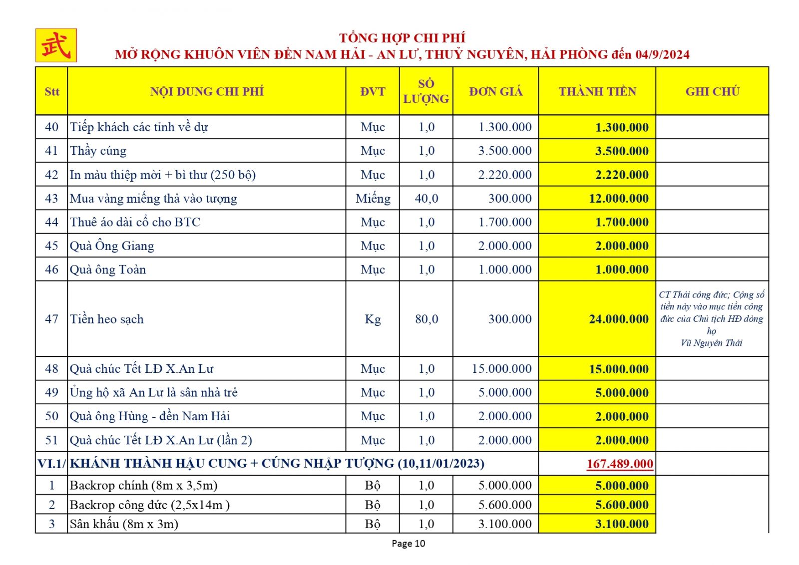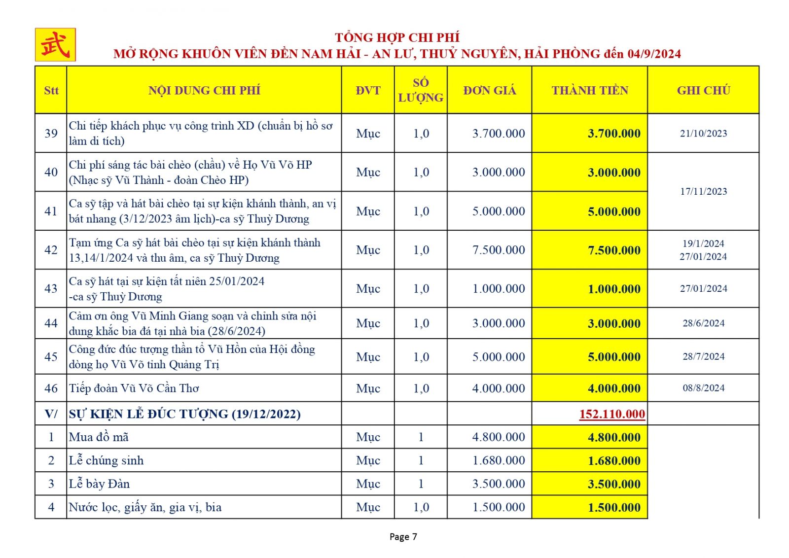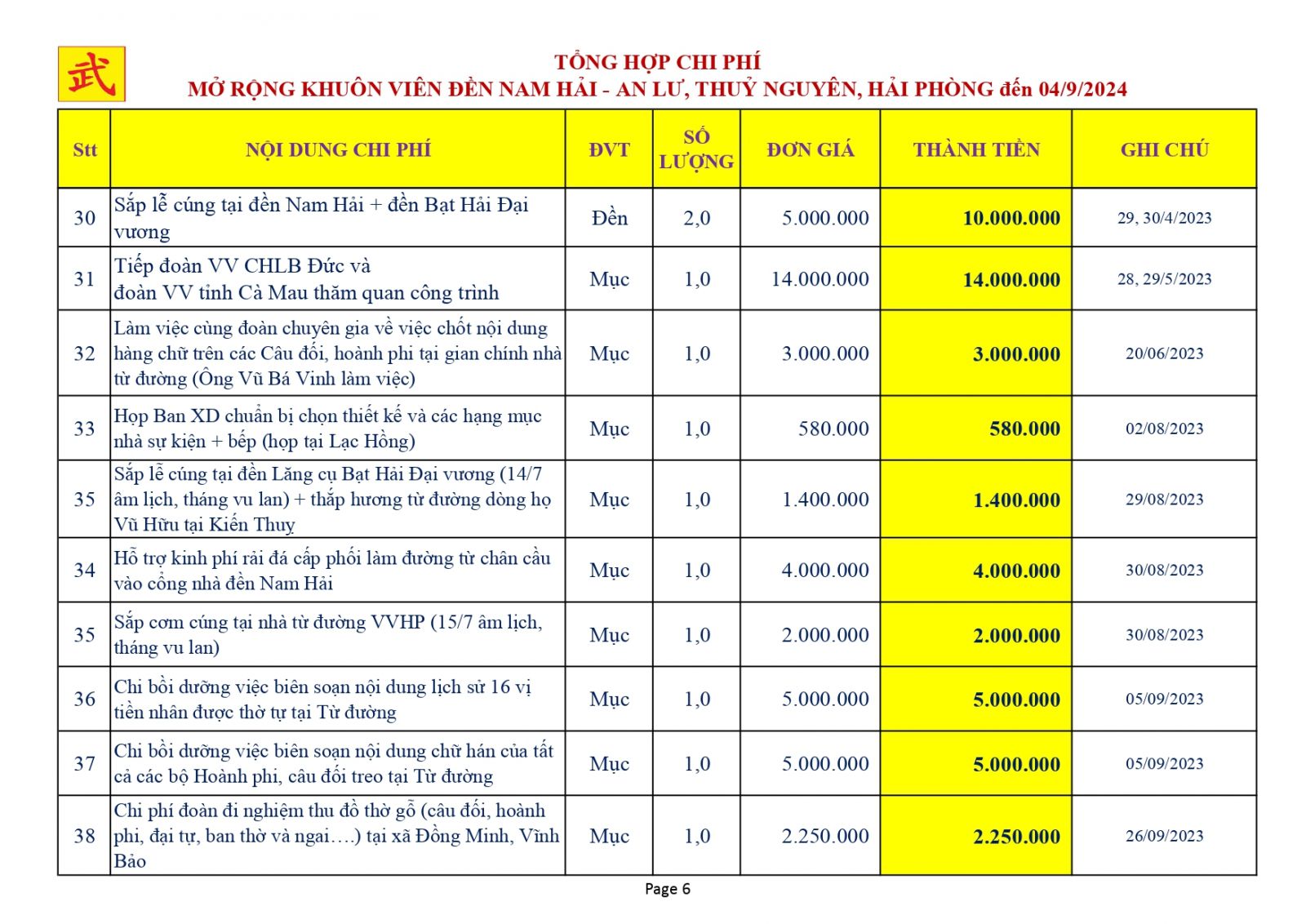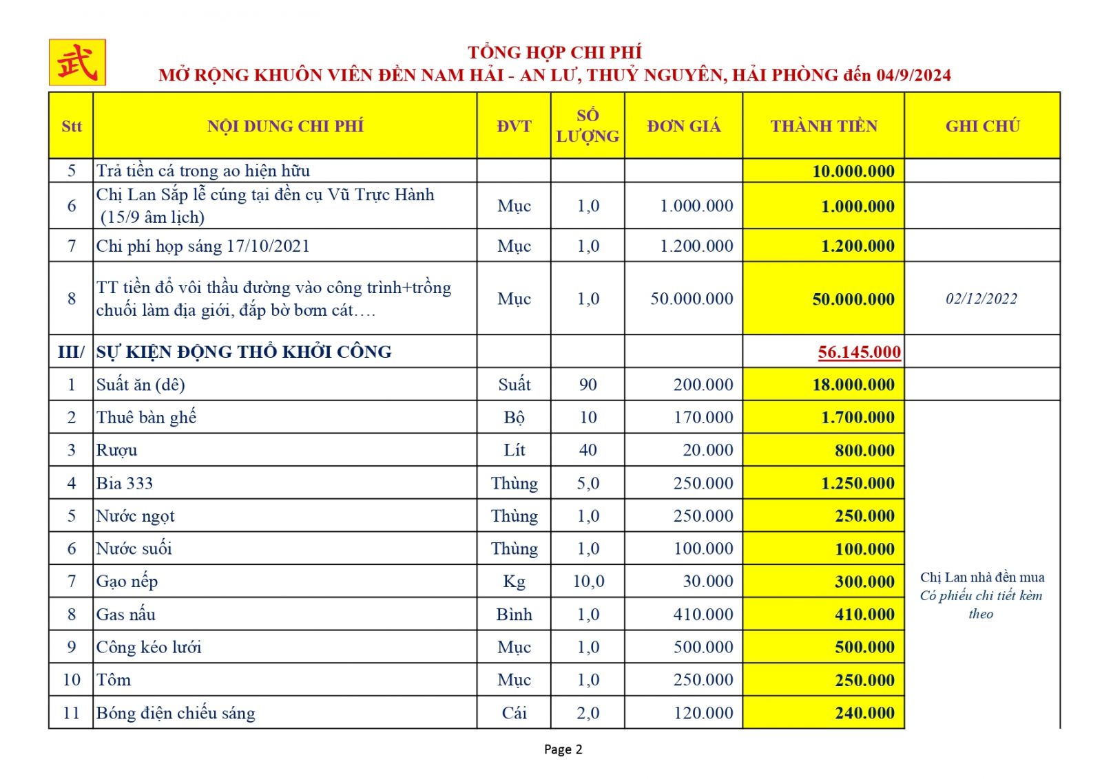Nhằm công khai minh bạch về tài chính trong quá trình Hội đồng dòng họ Vũ (Võ) TP. Hải Phòng xây dựng và cải tạo khuôn viên Đền Nam Hải, trong đó hạng mục xây dựng mới nhà thờ Tổ Đền Nam Hải ( Từ đường dòng họ VVHP). Thường trực HĐ dòng họ VHHP báo cáo chi tiết theo thứ tự như sau: 1. Tổng hợp danh sách các nhà hảo tâm Công đức; 2. Chi phí XD...; 3. Số tiền vay; 4. Số tiền còn thiếu (Nợ) của các tổ chức và cá nhân như sau: