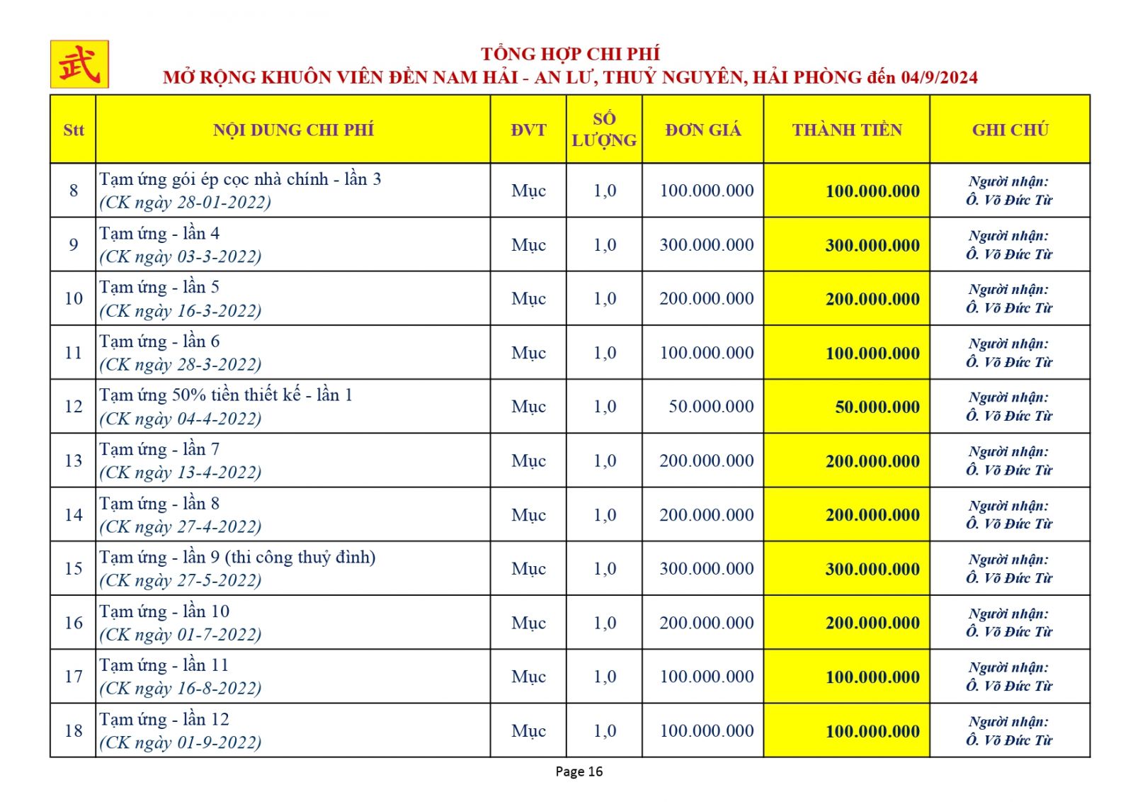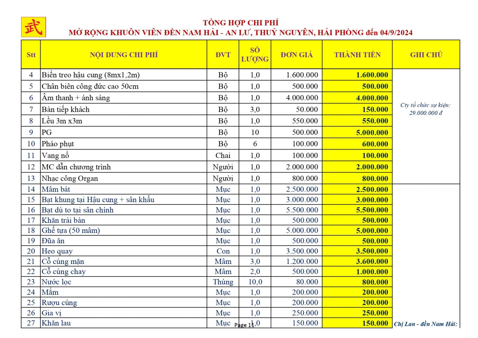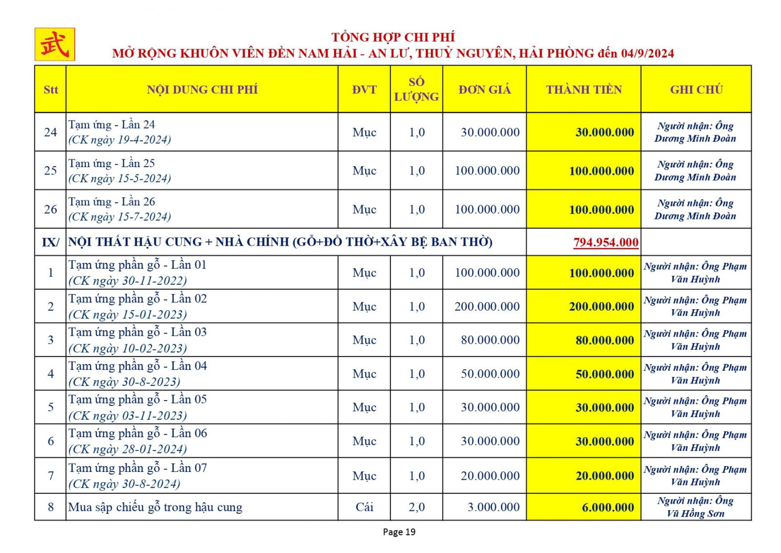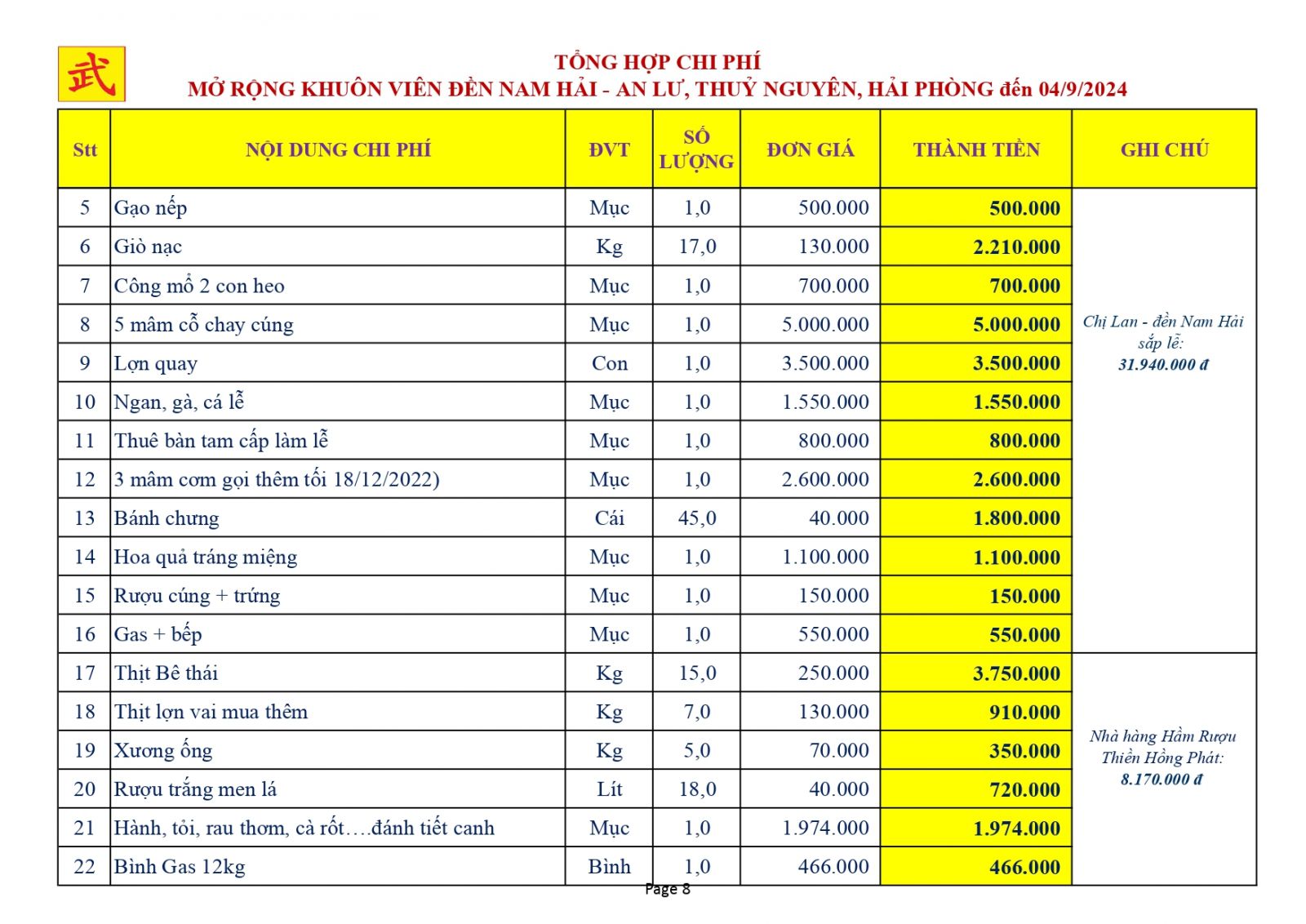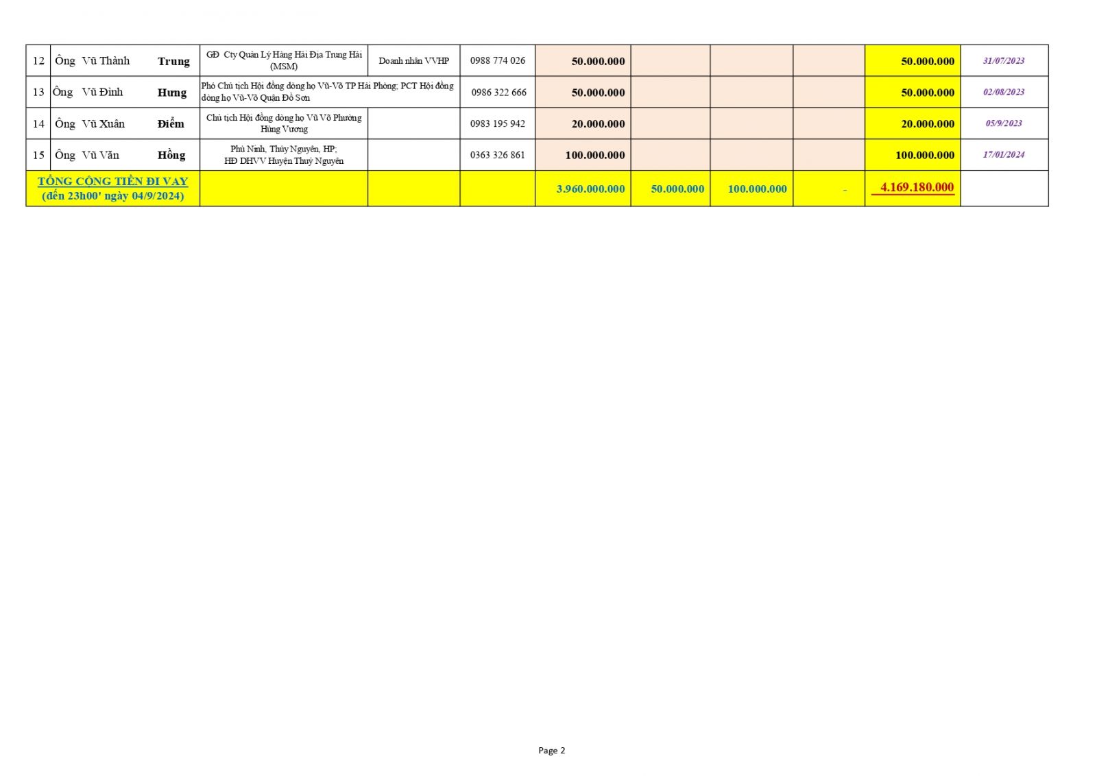 Nhằm công khai minh bạch về tài chính trong quá trình Hội đồng dòng họ Vũ (Võ) TP. Hải Phòng xây dựng và cải tạo khuôn viên Đền Nam Hải, trong đó hạng mục xây dựng mới nhà thờ Tổ Đền Nam Hải ( Từ đường dòng họ VVHP). Thường trực HĐ dòng họ VHHP báo cáo chi tiết theo thứ tự như sau: 1. Tổng hợp danh sách các nhà hảo tâm Công đức; 2. Chi phí XD...; 3. Số tiền vay; 4. Số tiền còn thiếu (Nợ) của các tổ chức và cá nhân như sau: