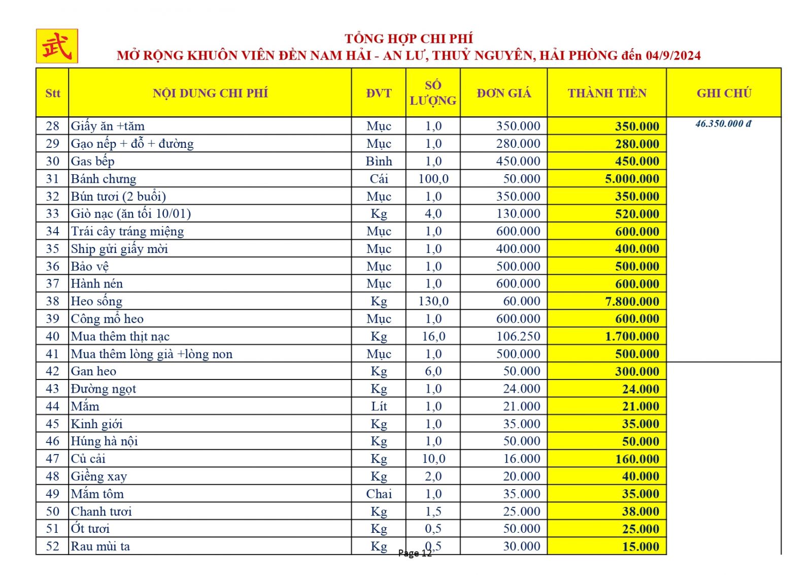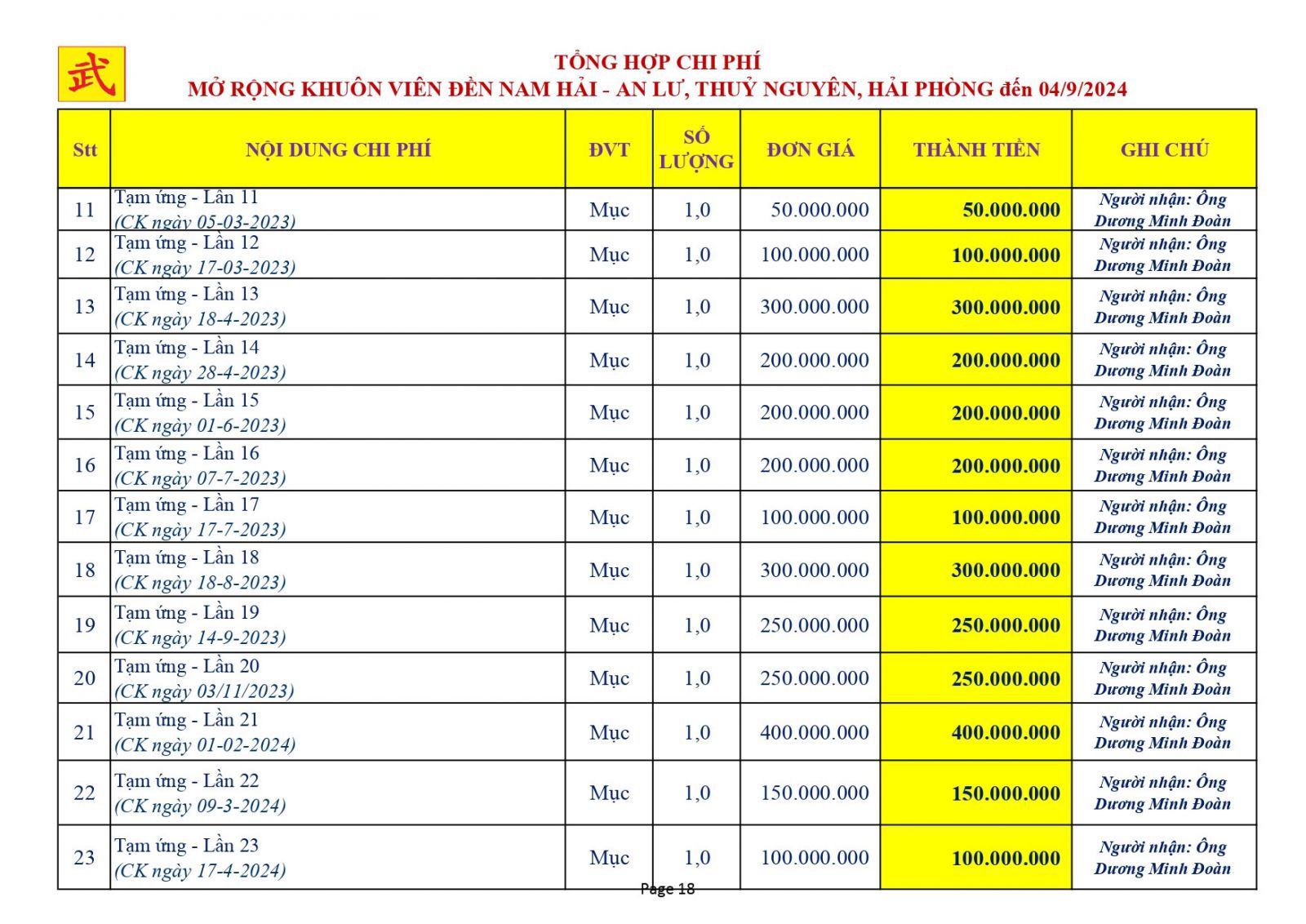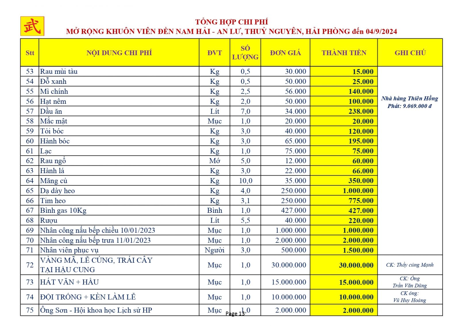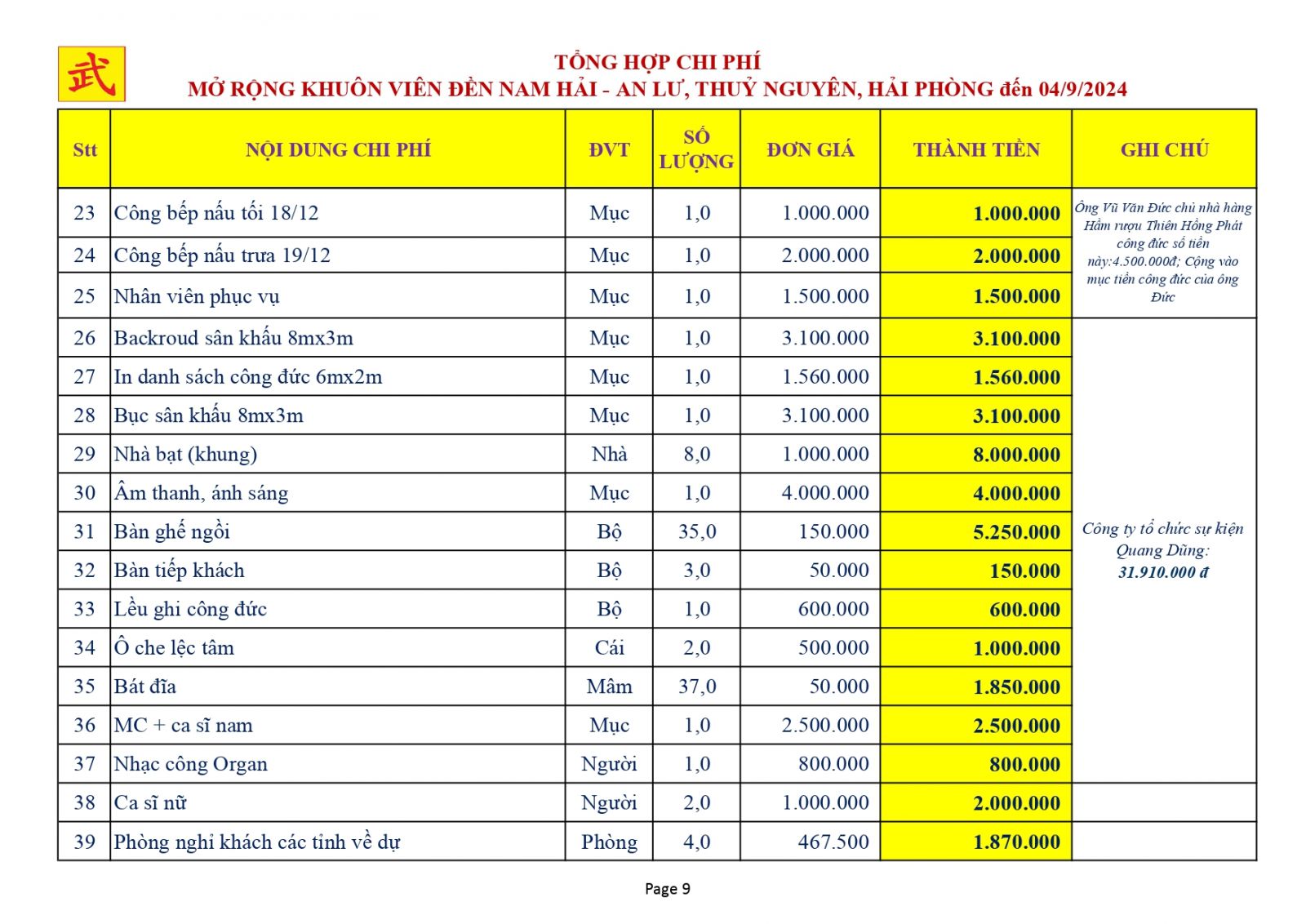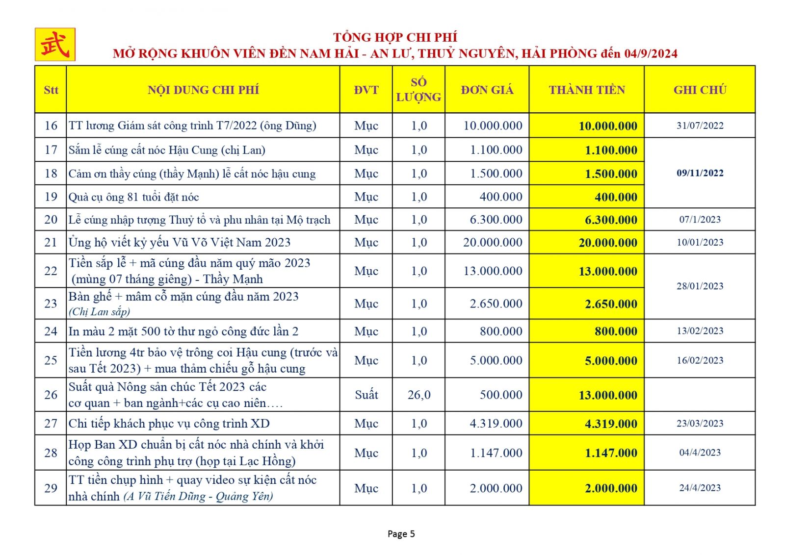 Nhằm công khai minh bạch về tài chính trong quá trình Hội đồng dòng họ Vũ (Võ) TP. Hải Phòng xây dựng và cải tạo khuôn viên Đền Nam Hải, trong đó hạng mục xây dựng mới nhà thờ Tổ Đền Nam Hải ( Từ đường dòng họ VVHP). Thường trực HĐ dòng họ VHHP báo cáo chi tiết theo thứ tự như sau: 1. Tổng hợp danh sách các nhà hảo tâm Công đức; 2. Chi phí XD...; 3. Số tiền vay; 4. Số tiền còn thiếu (Nợ) của các tổ chức và cá nhân như sau:
